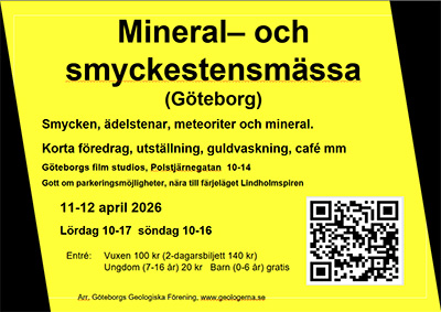 (Grönfärgade: Externa arrangemang) MässinfoÄrenden som rör mässan skickas till massagbg@geologerna.se Vid årsmötet den 9 mars valdes en ny ordförande, Mathias Stålek. För mer information se under Styrelsen. Där hittar du också årsmötesprotokollet och årsberättelsen för 2025. Vi är en aktiv förening! ------------------------------------------------------ På tisdagar, udda veckor, träffas studiecirkeln för daglediga. Vi använder boken "Jorden - illustrerat uppslagsverk" som kursbok. De teman som nämns nedan som teman hänvisar till är olika avsnitt i boken. 24 mars (tisdag) 13-15.15 1 april 19.00 - 20.30 7 april (tisdag) 13-15.15 10 april 12- 11 april (lördag) 10-17 Mineral - och smyckestensmässan 2026 12 april (söndag) 10-16 Mineral - och smyckestensmässan 2026 15 april 19.00 - 20.30 21 april (tisdag) 13-15.15 29 april 19.00 - 20.30 3 maj (söndag) kl 13 - 14 Föredrag 5 maj (tisdag) 13-15.15 10 maj (söndag) Utflykt 13 maj 19.00 - 20.30 19 maj (tisdag) 13-15.15 27 maj 19.00 - 20.30 30 maj (lördag) Utflykt till Sjönevads granatgruva 30 augusti (söndag) Utflykt till Bölet 20 september (söndag) Utflykt till Derome utanför Varberg i Halland. 18 oktober (söndag) besöker vi Oslos geologiska museum.